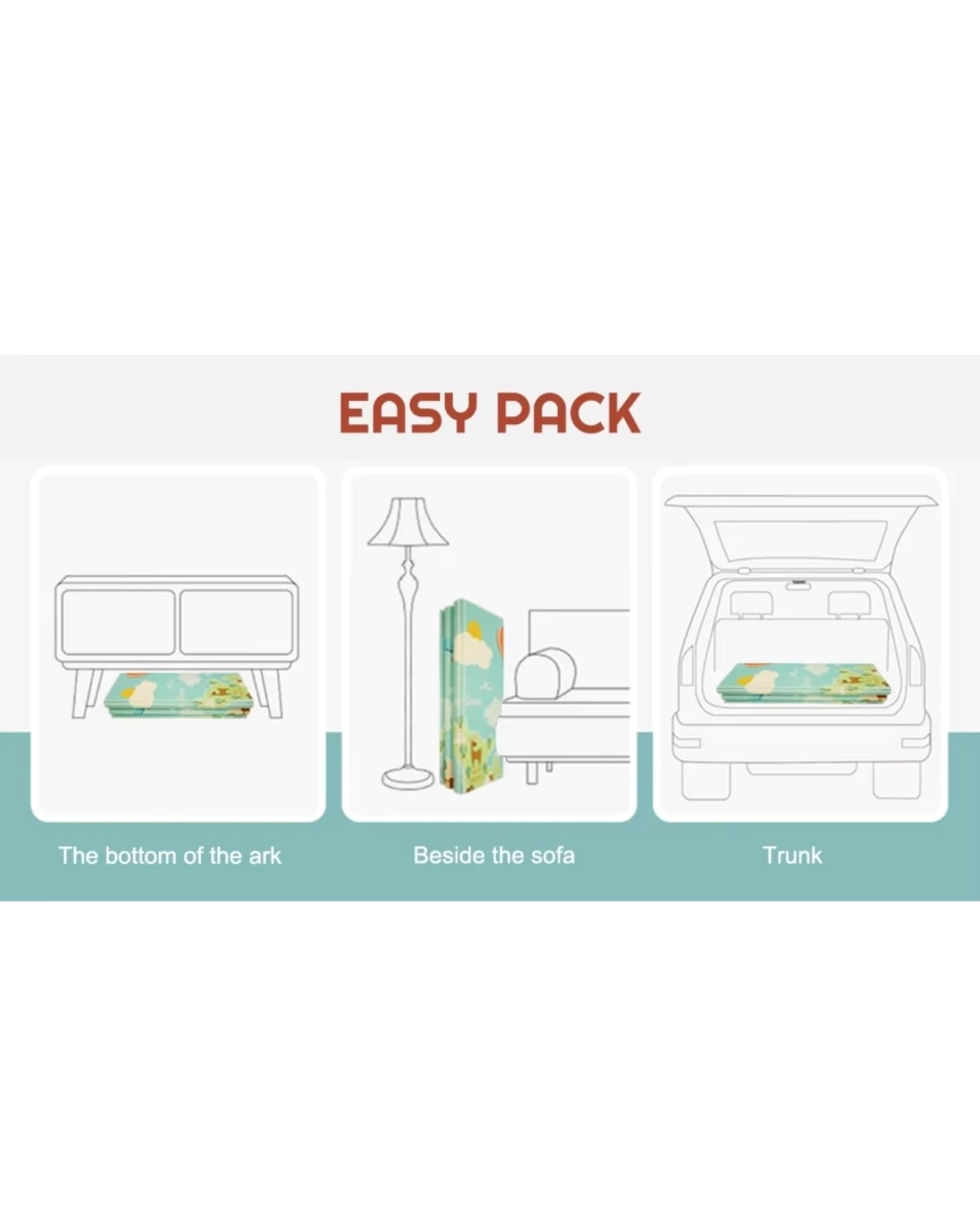 La alfombra puede plegarse de manera rápida y accesible, facilitando su transporte y guardado. Sus medidas permiten adaptarse al baúl de un auto, en un placard o debajo de la cama