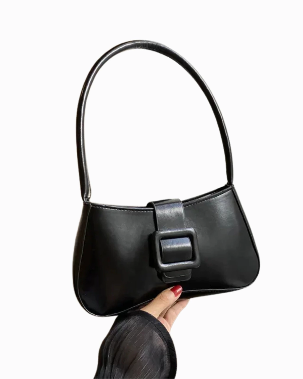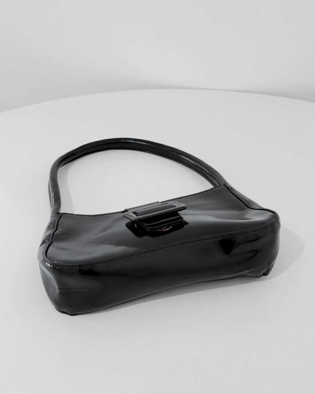 Mini bag con correa fija no regulable. Bolsa principal con cierre, también trae una cinta de cuero sintético con una hebilla que cierra a presión sobre la bolsa principal. Interior de cuero sintético.
