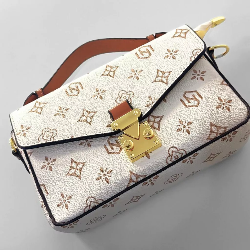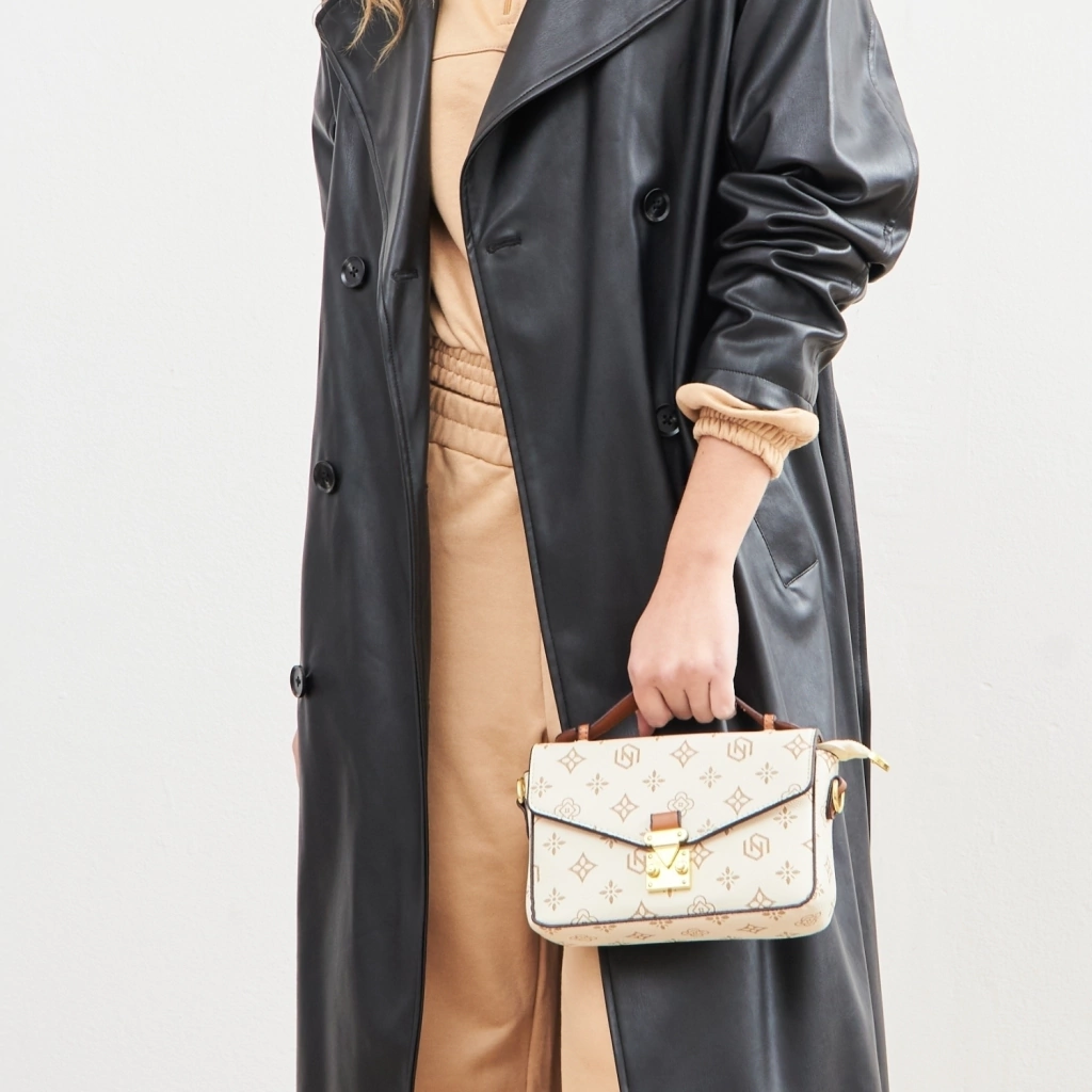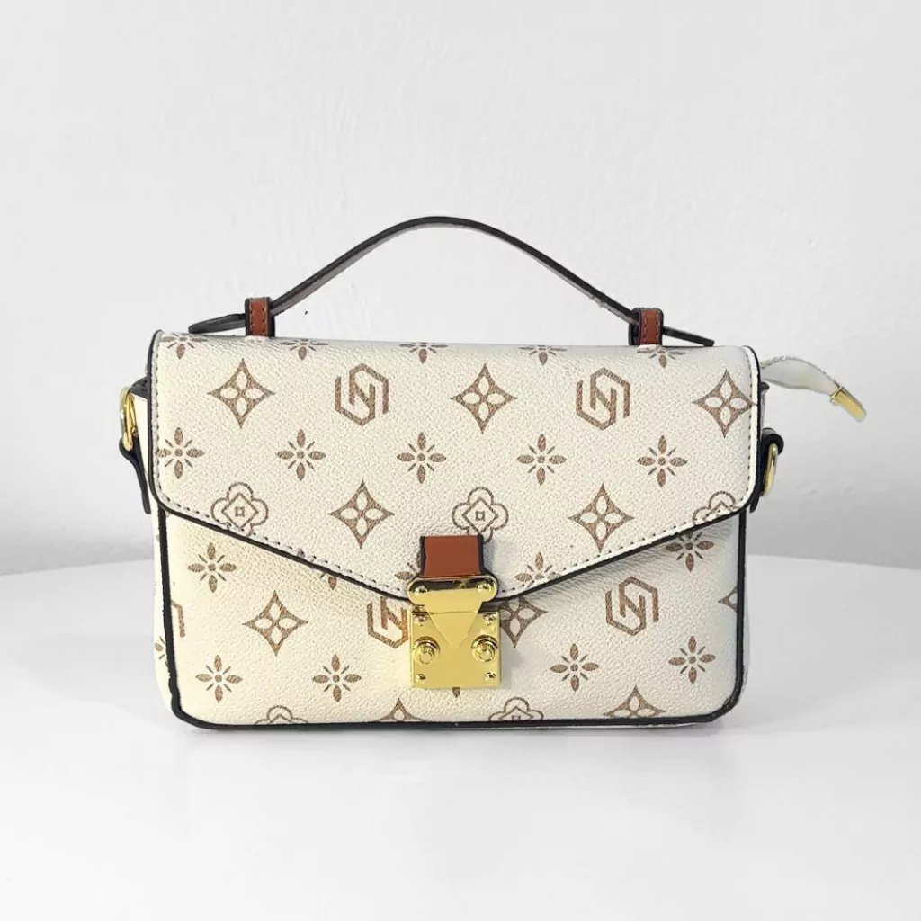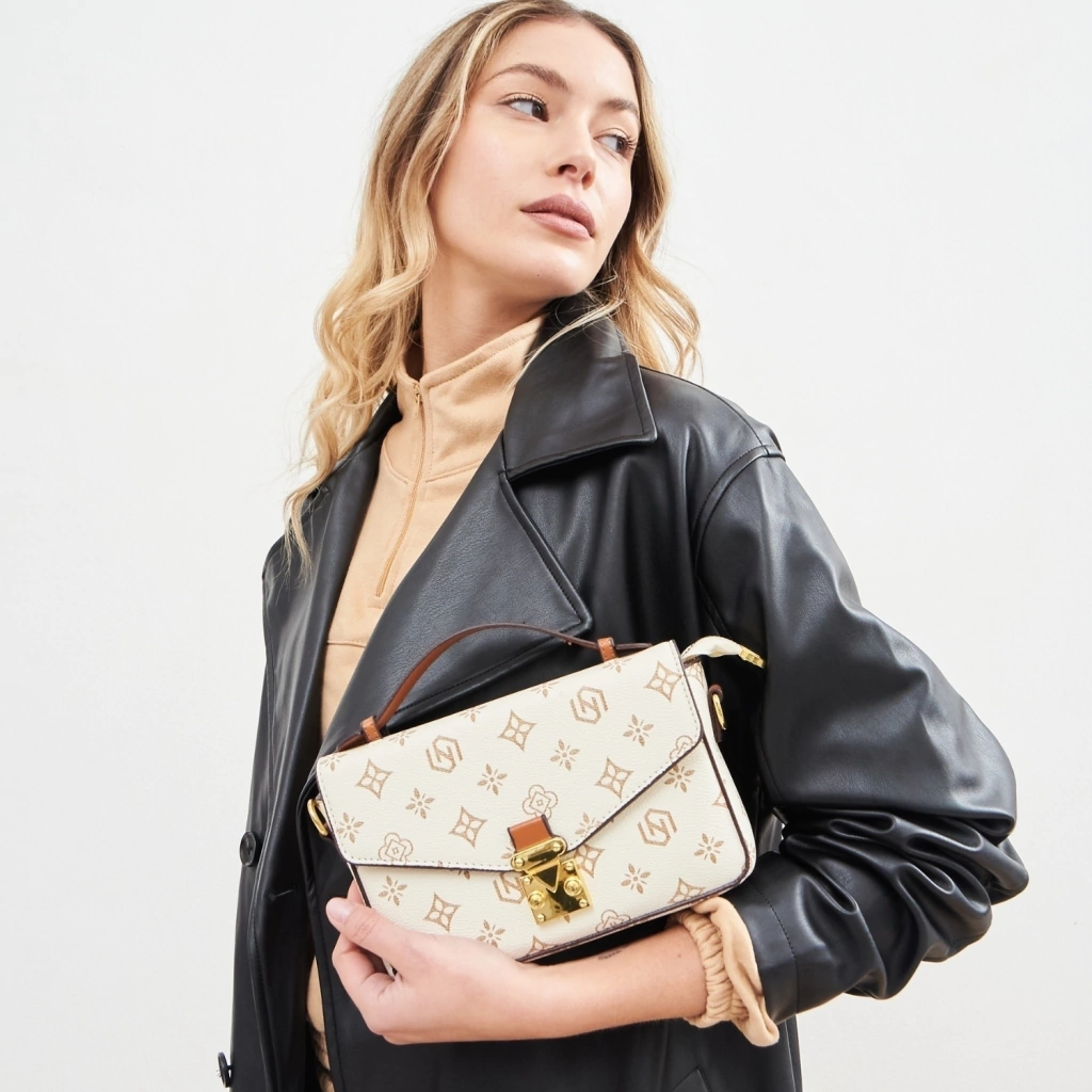 Cartera de hombro con manija corta de mano y correa larga regulable y desmontable. Tapa con cierre de hebilla. Herrajes en dorado. Interior con cierre y forrado en tela poliester con pequeño bolsillo.