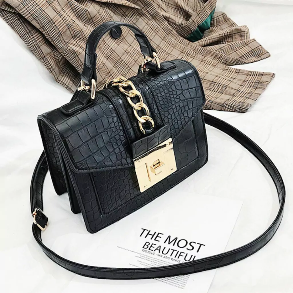 Detalles: Posee 2 compartimientos internos con cierre principal. Correa larga de PU desmontable y regulable. Agarre corto de mano. Tapa que cierra con hebilla manual. Herrajes dorados.