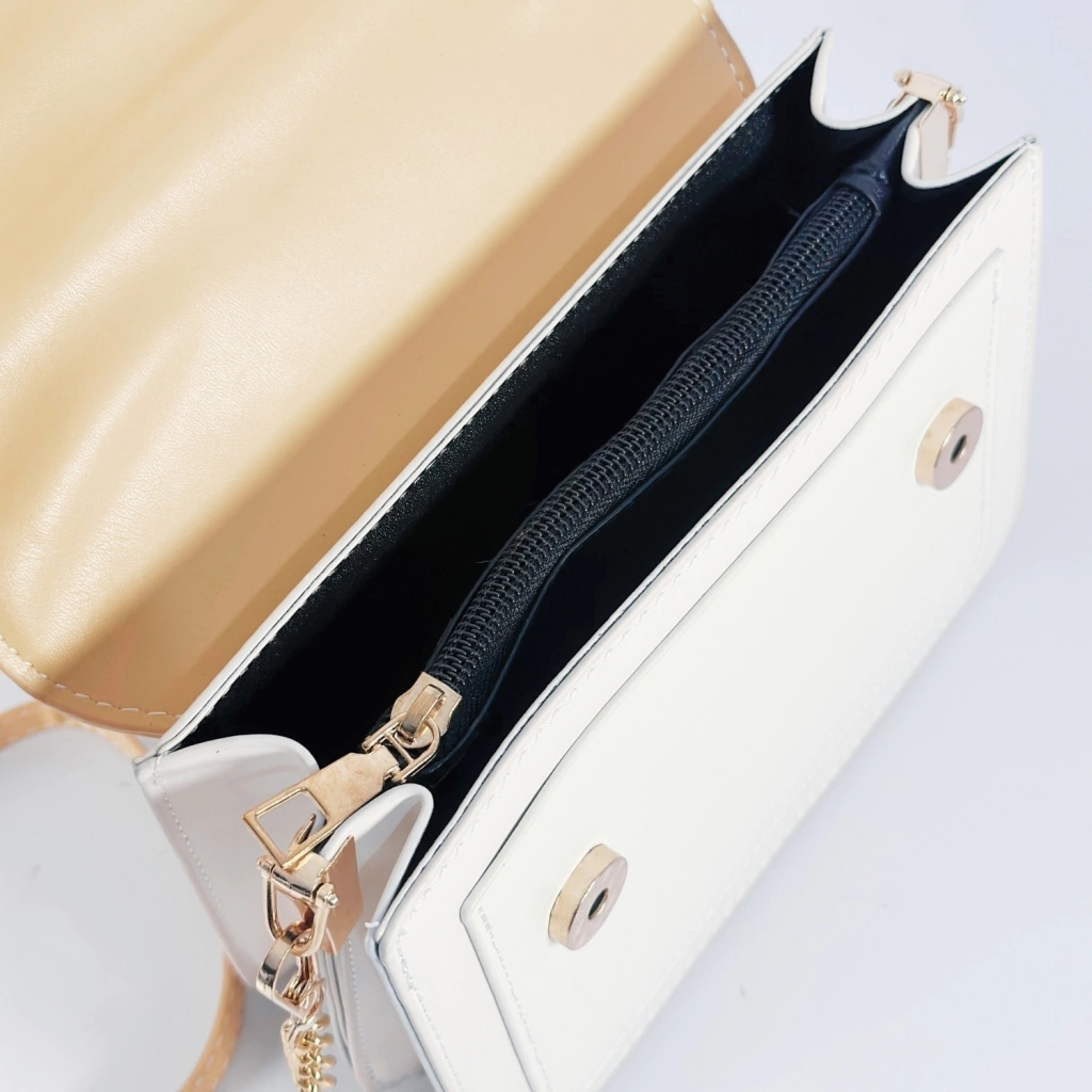 Cartera estilo bandolera, posee 1 cadena larga y otra correa de tela, ambas desmontables. Tapa que cierra con 2 botones a presion. Bolsillo externo. Interior de cuero sintetico con 1 bolsillo con cierre que divide la cartera en 2 espacios. Herrajes dorados color oro.