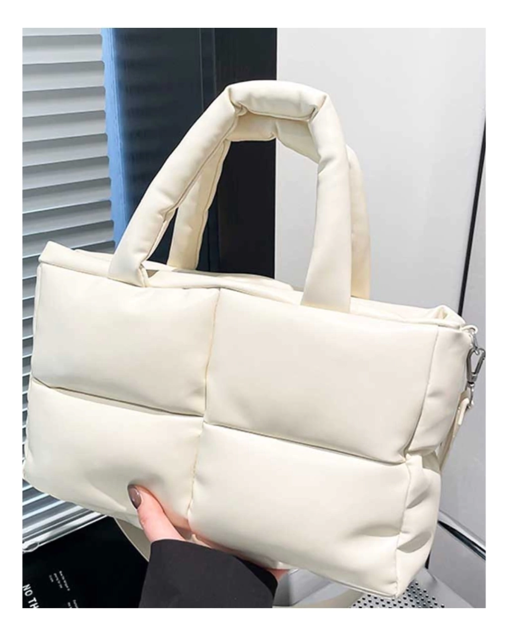 Tote Puffer con asas cortas acolchadas. Correa de cuero sintético desmontable no regulable. Bolsa principal con cierre. Interior forrado en tela. Bolsillo interno con cierre. Herrajes en plateado.