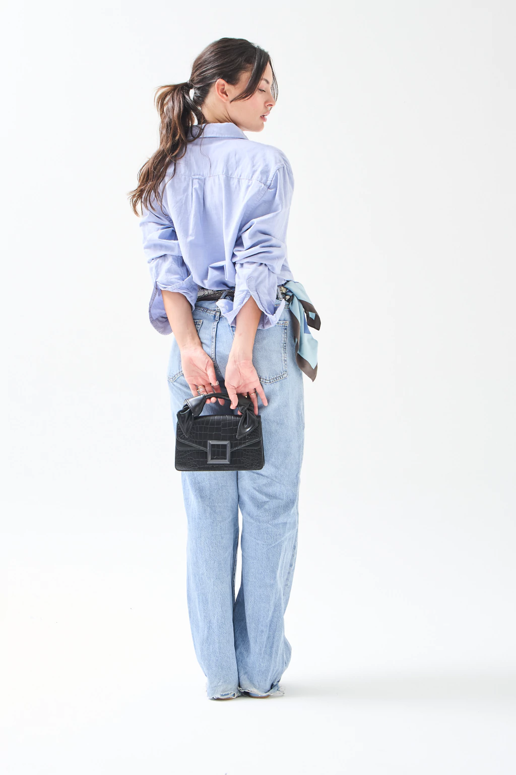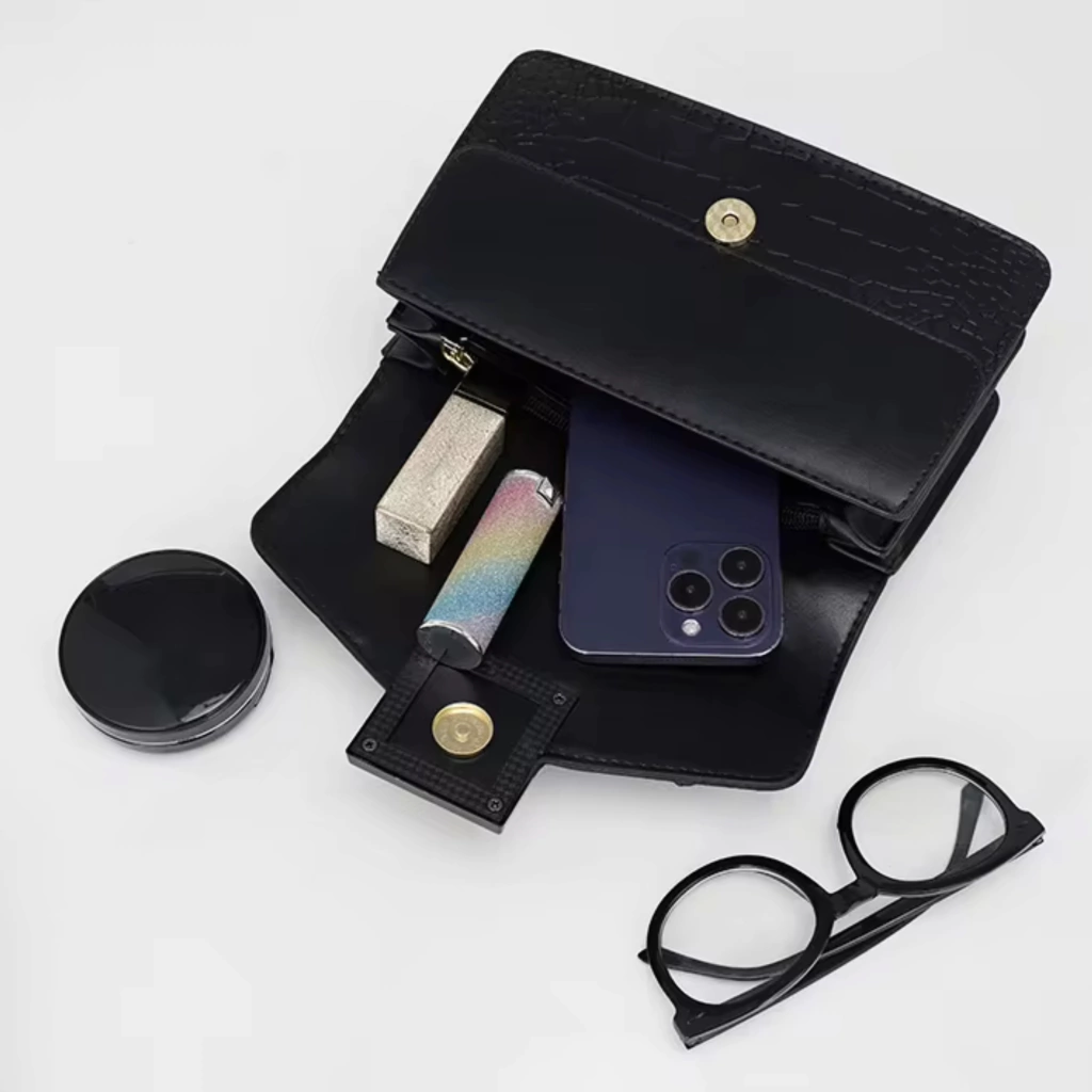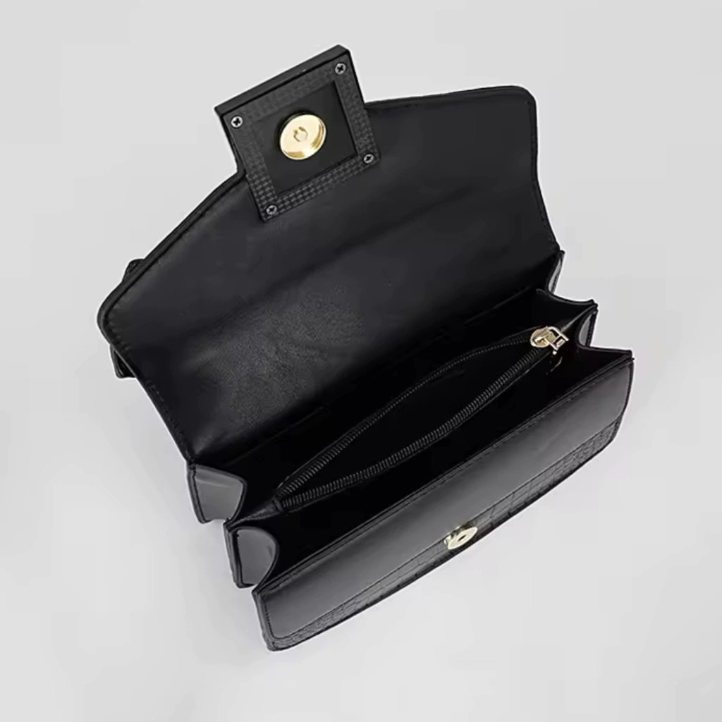 Detalles: Cartera de mano. Correa larga desmontable y regulable. Tapa con hebilla a presion. Interior de cuero sintetico. Tres divisiones, la central con cierre. Herrajes en dorado.