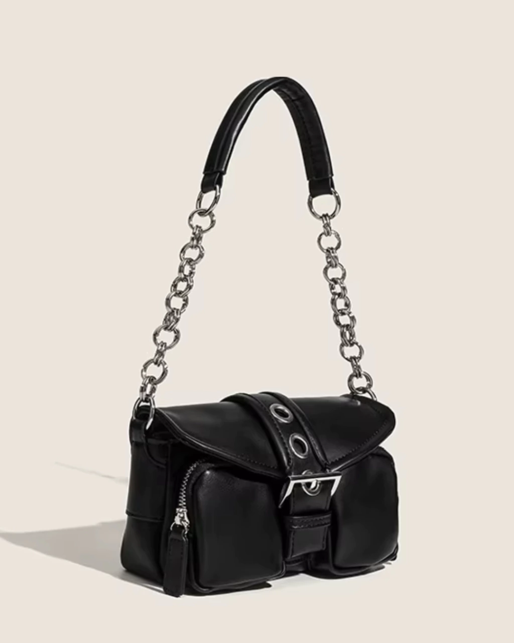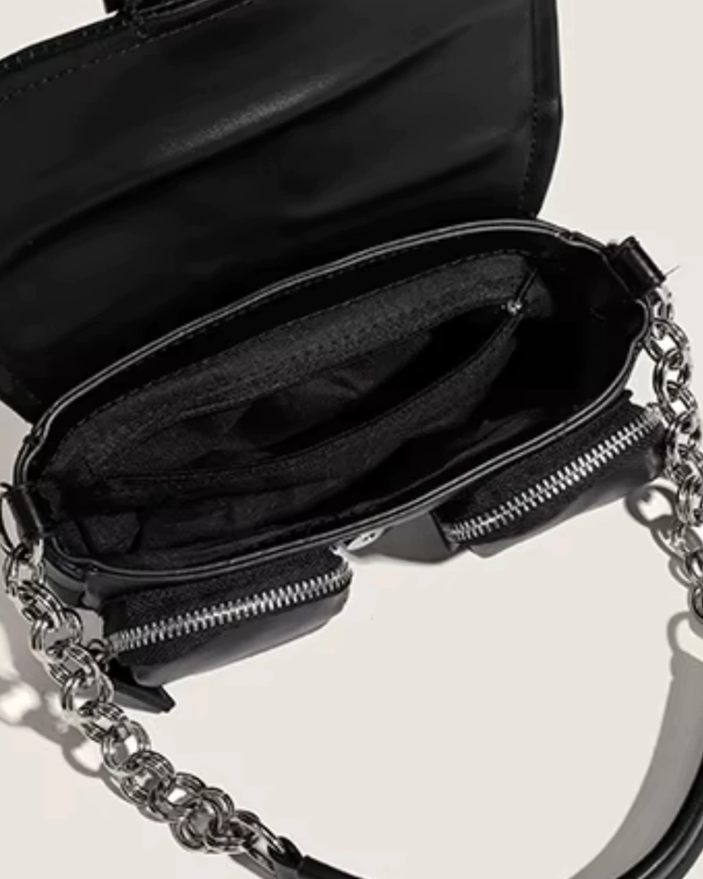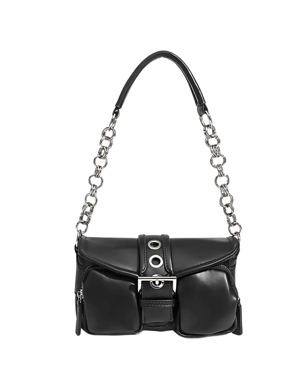 Detalles: Cartera estilo baguette. Cadena fija de hombro. Tapa que cierra con botón a presión con hebilla decorativa .Interior forrado en tela poliester con un pequeño bolsillo con cierre. Dos bolsillos pequeños externos con cierre. Herrajes en color plata.