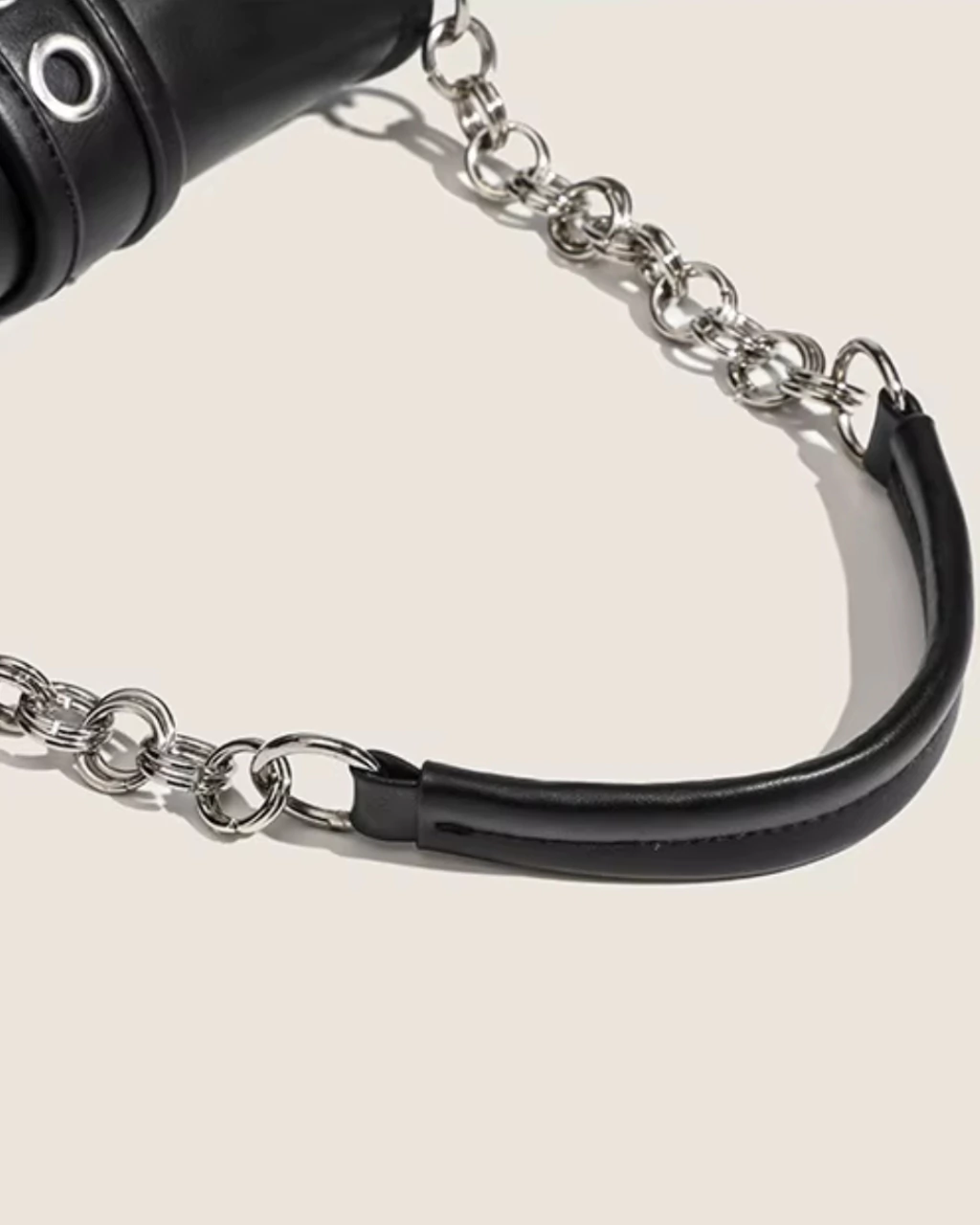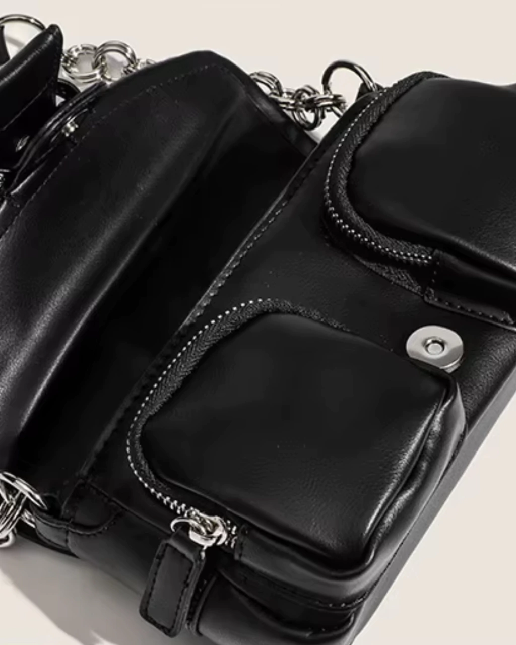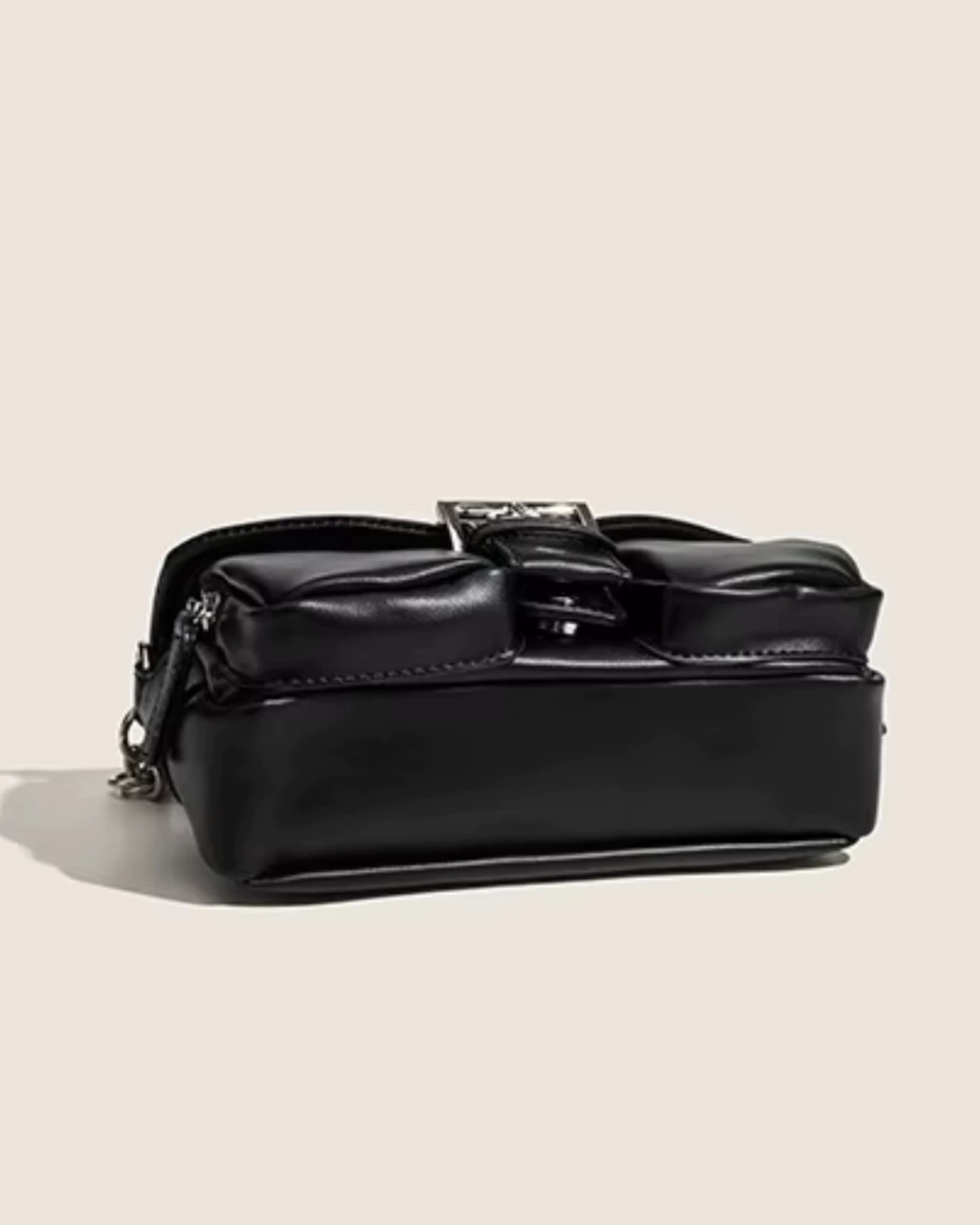 Detalles: Cartera estilo baguette. Cadena fija de hombro. Tapa que cierra con botón a presión con hebilla decorativa .Interior forrado en tela poliester con un pequeño bolsillo con cierre. Dos bolsillos pequeños externos con cierre. Herrajes en color plata.