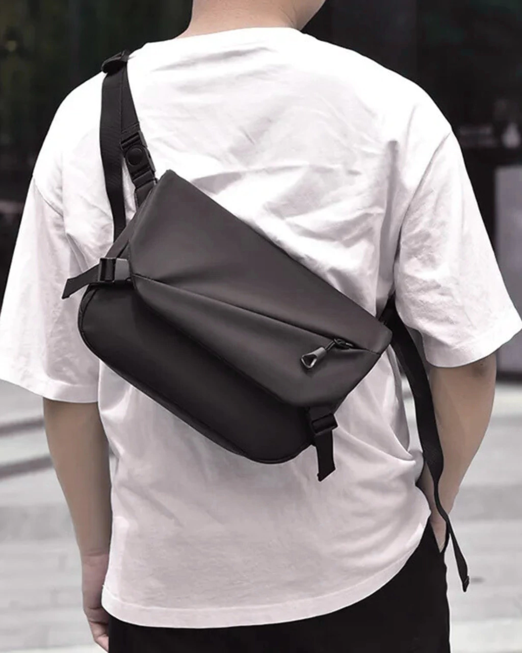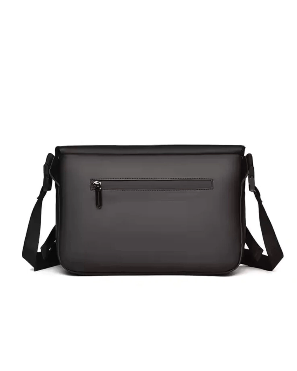 Trae correa regulable no desmontable. Bolsa principal con cierre. Interior forrado en tela con un divisorio central. Tapa cierra con dos broches plásticos manuales. Bolsillo externo con cierre por debajo de la tapa. También posee un bolsillo con cierre en la tapa del lado externo y otro bolsillo externo con cierre en la parte de atrás. Herrajes en color negro.