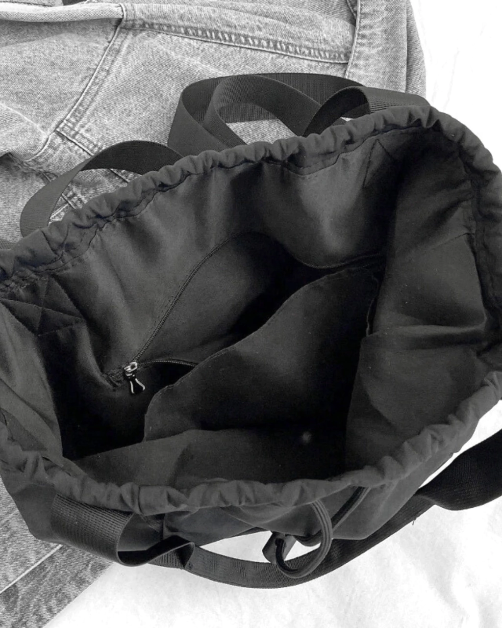 Mochila con asas fijas que permiten darle uso como bolso de hombro. Cuenta con correas ajustables. Bolsa principal cierra con una hebilla a presión y cordón ajustable. Interior forrado en tela con un bolsillo con abrojo. Bolsillo externo con cierre.