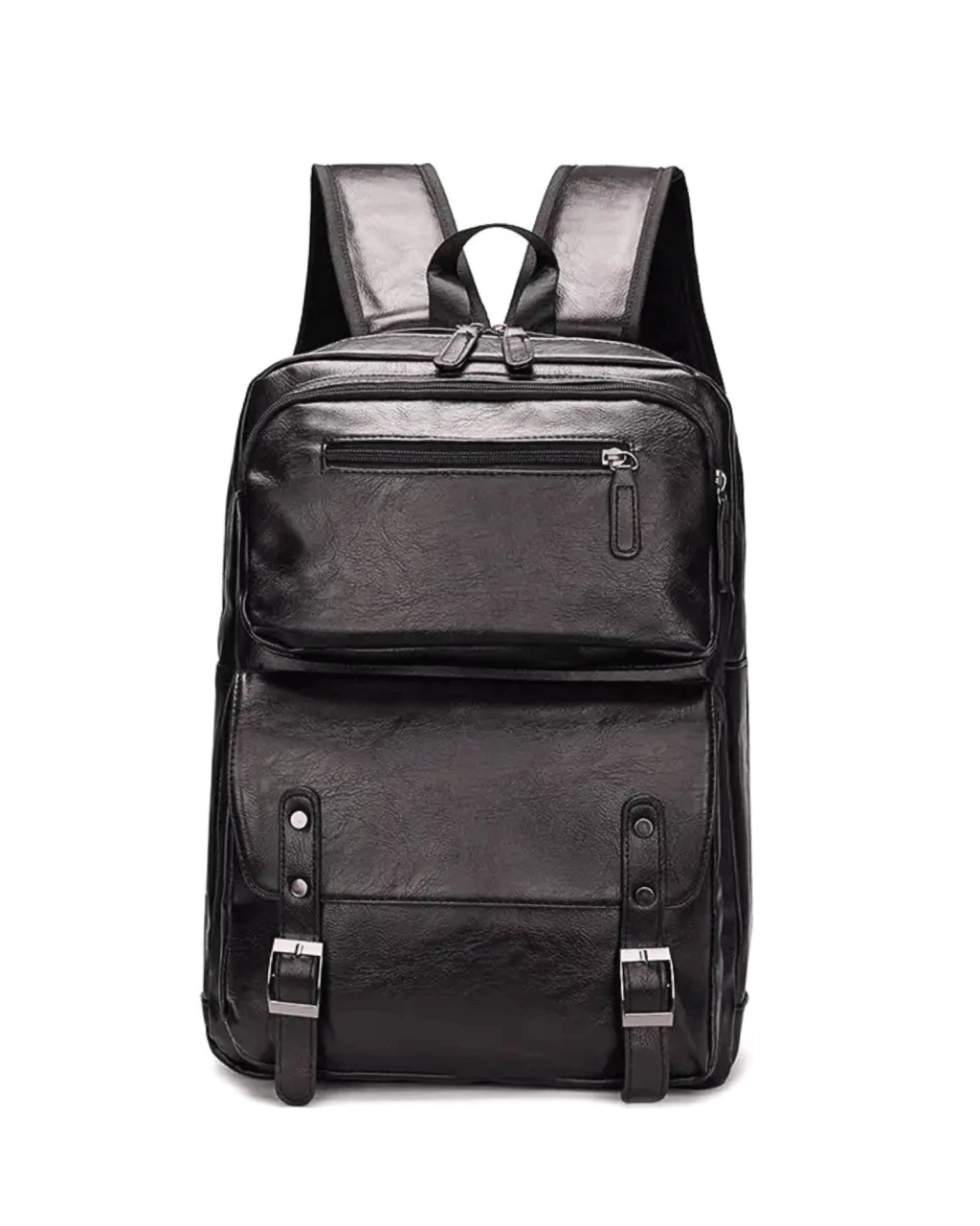 Compartimento principal con cierre superior recto. Interior forrado en tela poliester con bolsillos abiertos y uno con cierre. En el frente posee tres bolsillos externos: dos superior con cierre y uno central con solapa y dos broches imantados y hebillas decorativas. Las correas son acolchonadas, regulables y no desmontables. Tiracierres de cuero sintético. Herrajes en gris plomo.